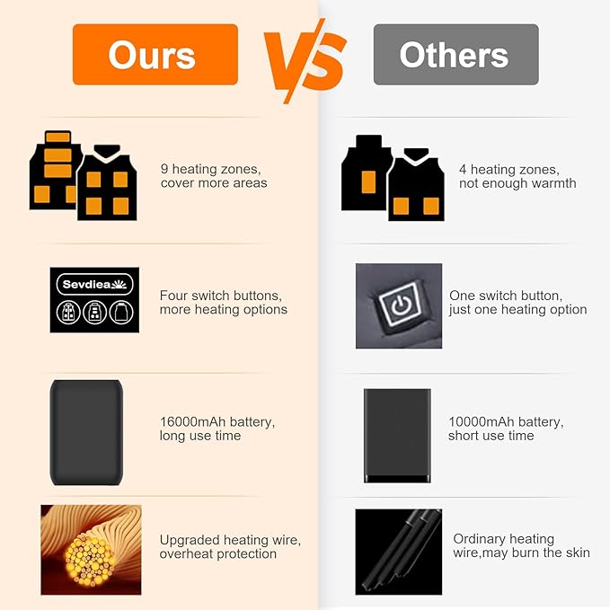 9 heating zones (neck, chest, back, waist, abdomen) keep your body core warm even in sub-zero temperatures.